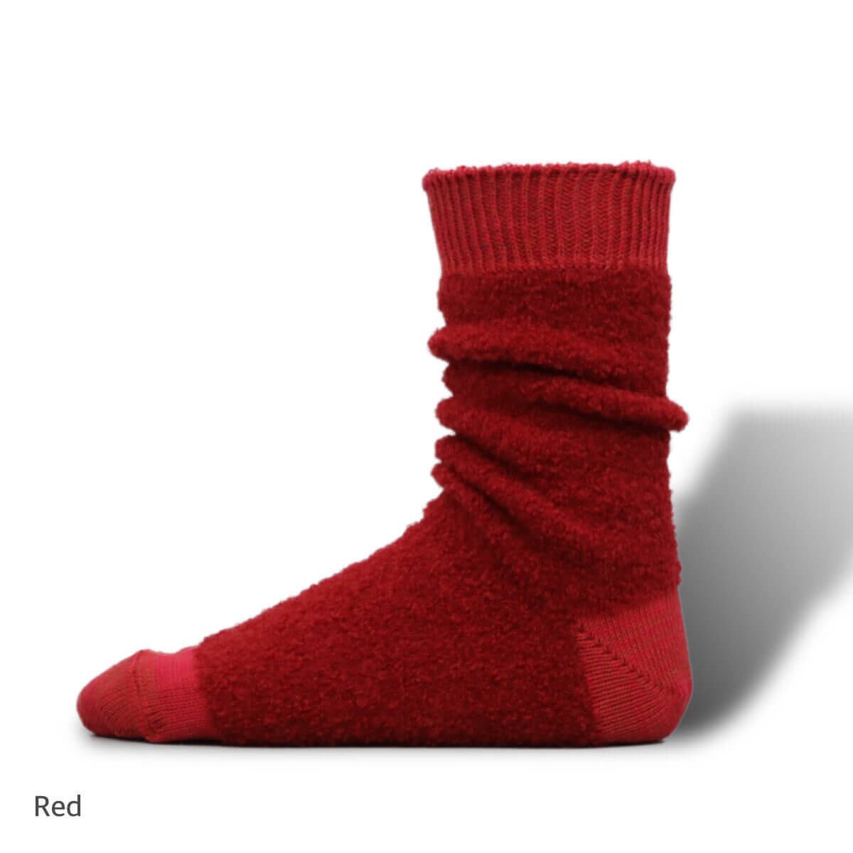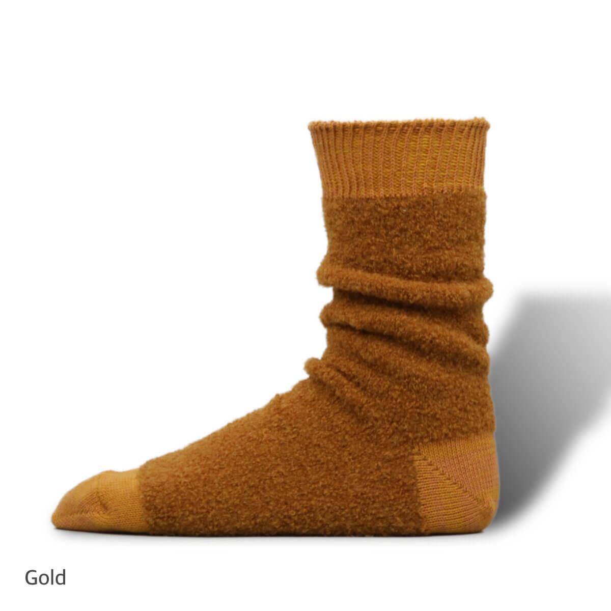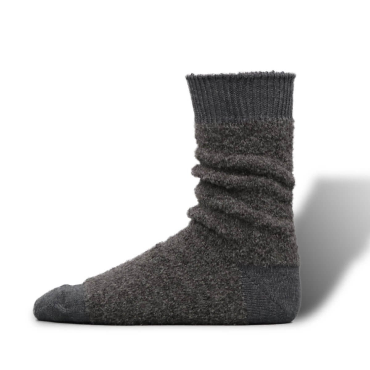 アルパカの初刈りの毛のみを使用した最高品質のブークレ糸で編み上げられ、ループ状の糸は空気を含みやすく、とても暖かいソックスに仕上がっています。