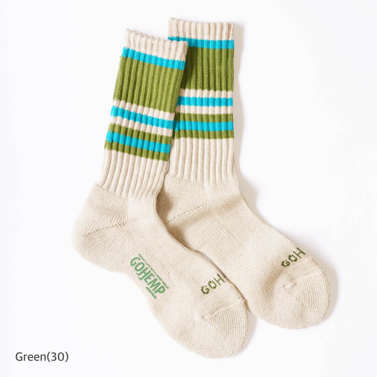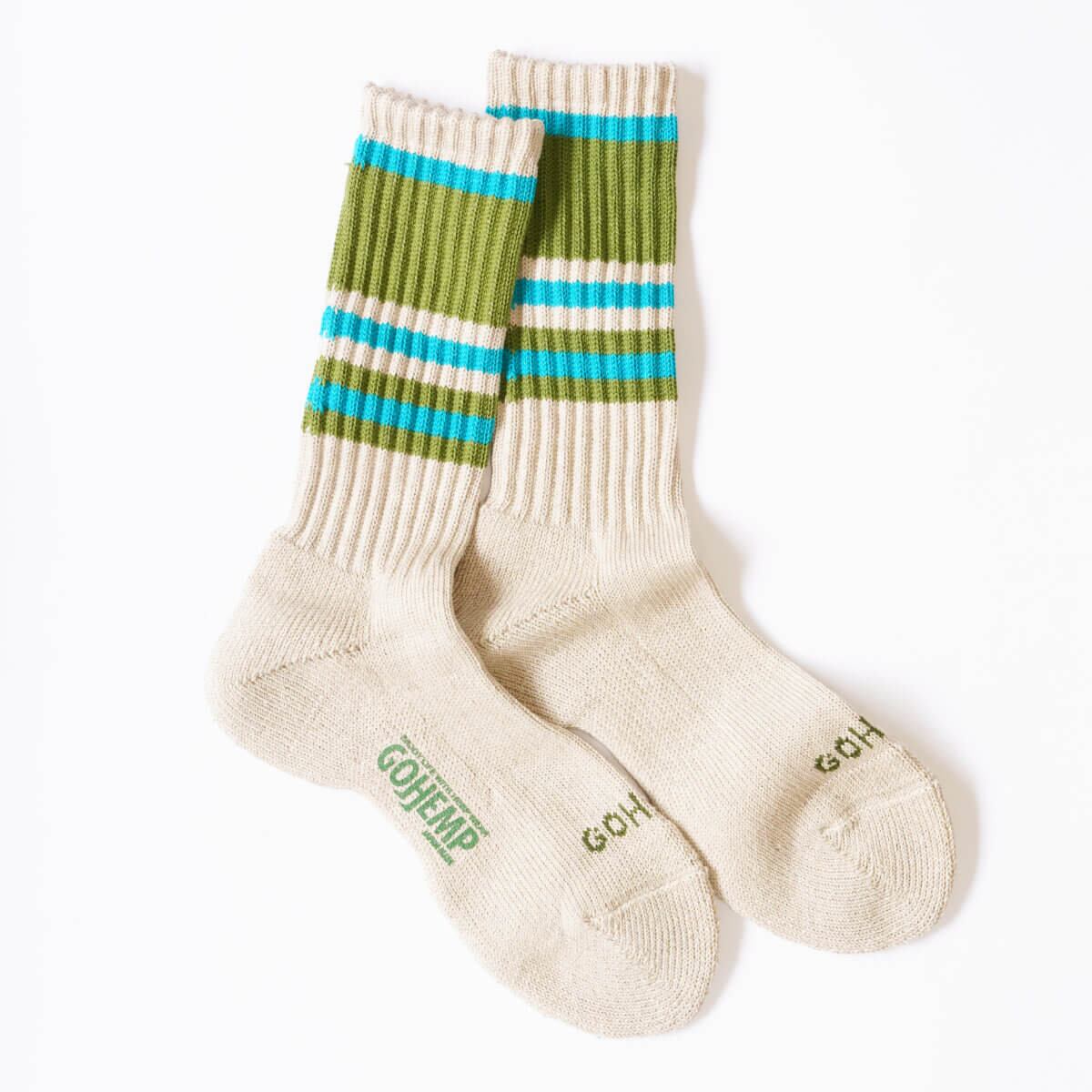 ランダムなストライプの配色と足先のGOHEMPロゴがポイントです。