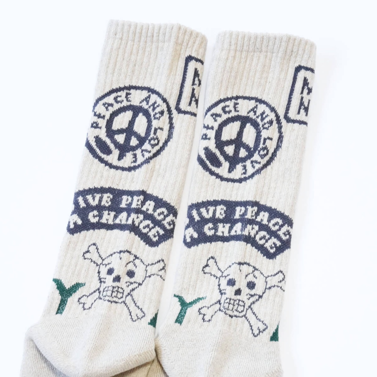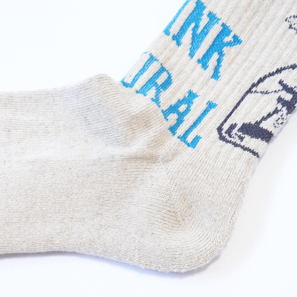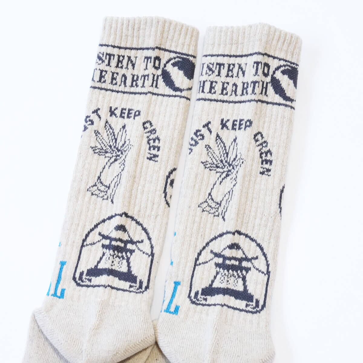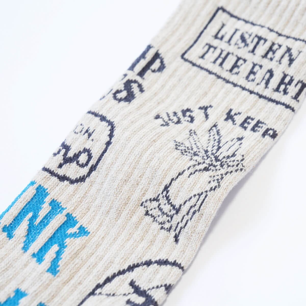 コットン×ヘンプの自然なナチュラルカラーに個性的な手描き風のグラフィックデザインが映えるクルーソックス。