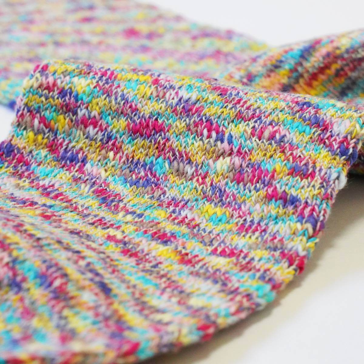 スプラッシュシリーズは、別名「雲糸」と呼ばれる太番手のスラブ糸(ムラ糸)を絣染め(かすりぞめ)にして編み込んだ色鮮やかなメランジカラーが人気です。