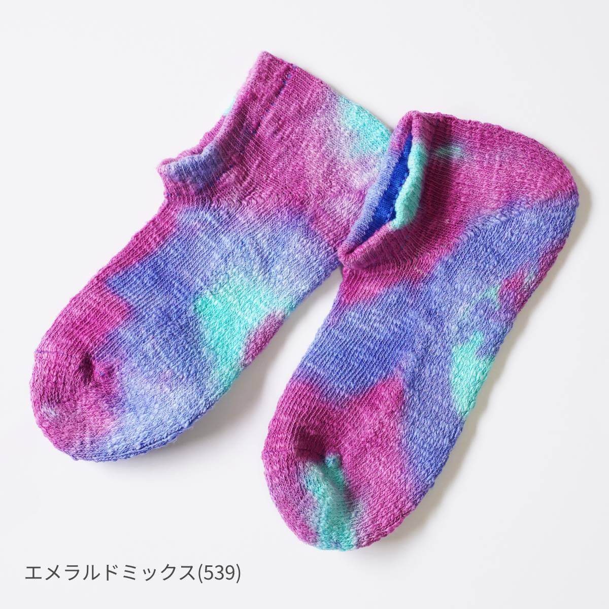 プツプツとしたネップが織り込まれた綿素材のスラブ糸を使用したタイダイ染めのスニーカー丈ソックスです。