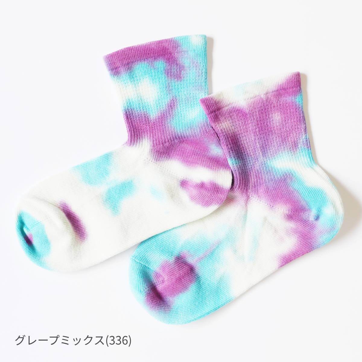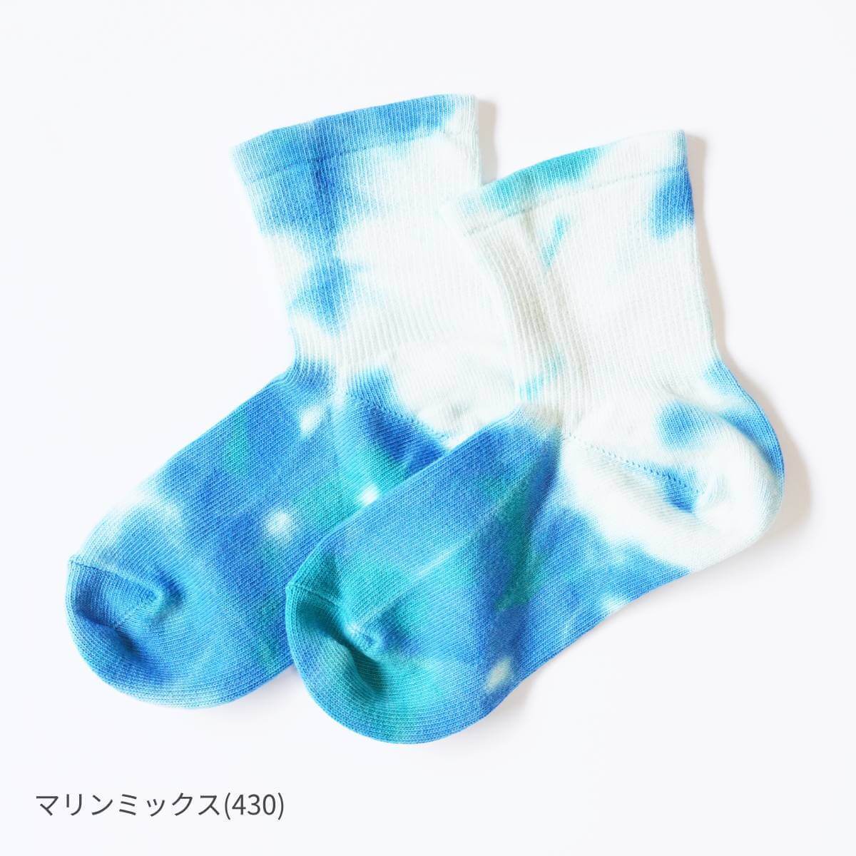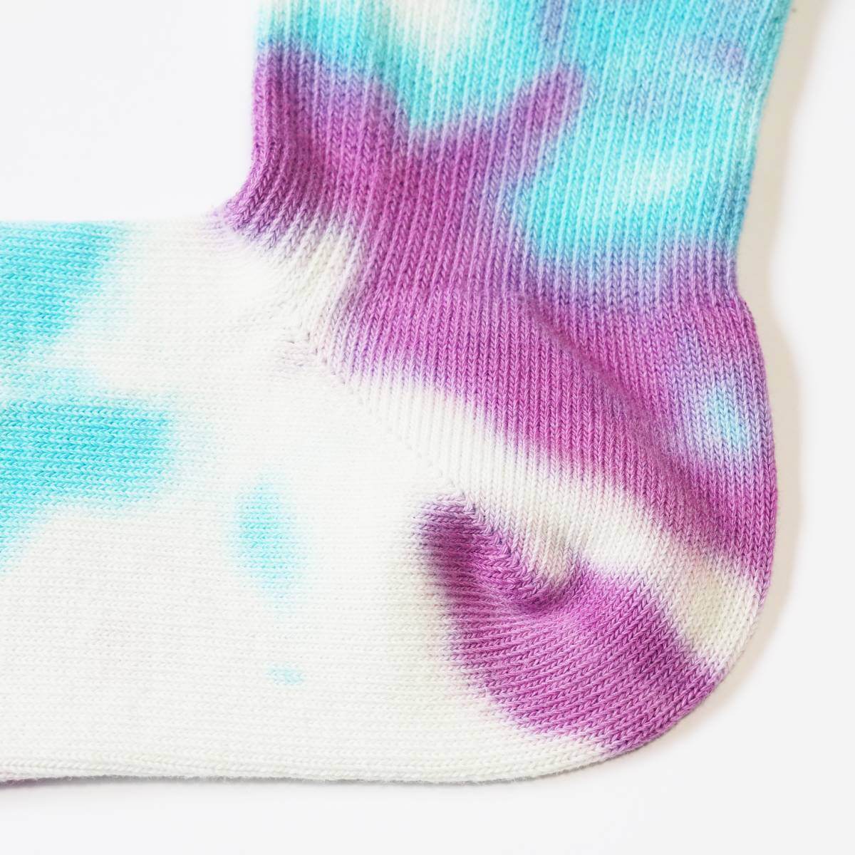 節のないソフトな肌触りの糸を使用し、やや薄手に編み立てたタイダイ染めのミッド丈ソックスです。