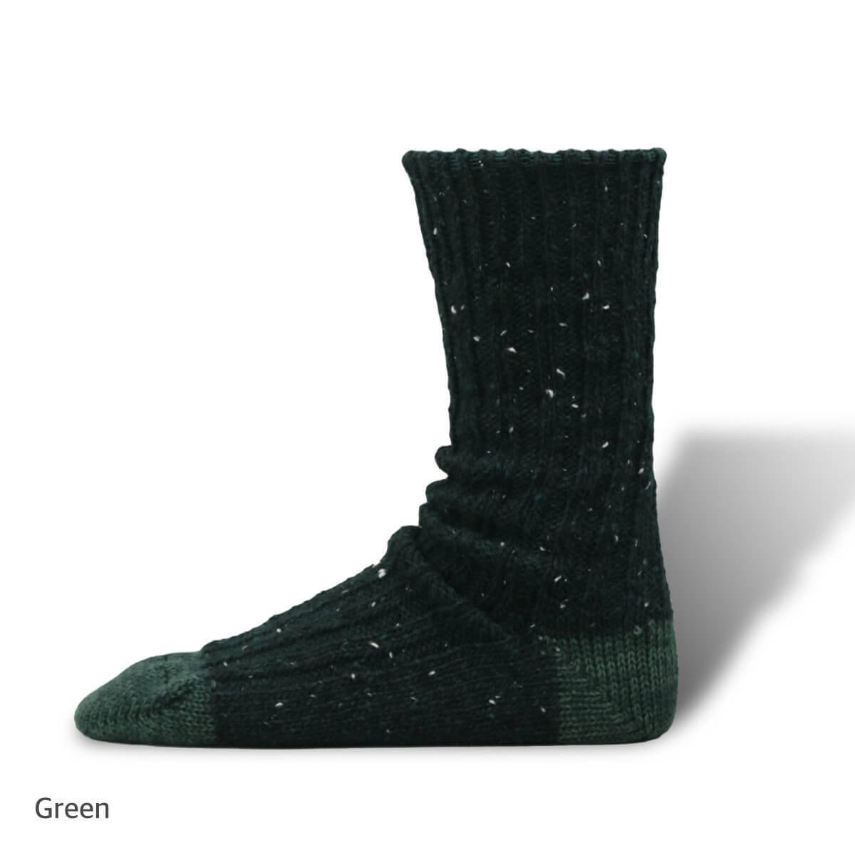 リサイクルウール特有のネップや色合いの不均一感が特徴的なリブソックス。
