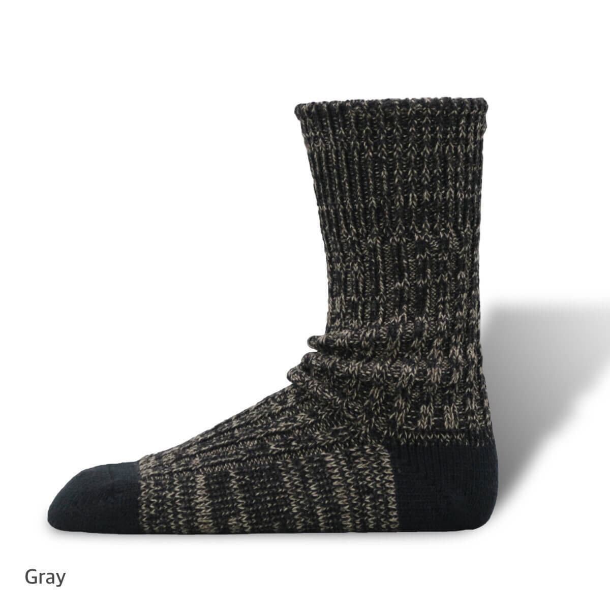 素材として珍しいウォッシャブルウールのカーデッドヤーンと特殊な方法で紡績された混紡糸を組み合わせて編んだローゲージリブソックス。