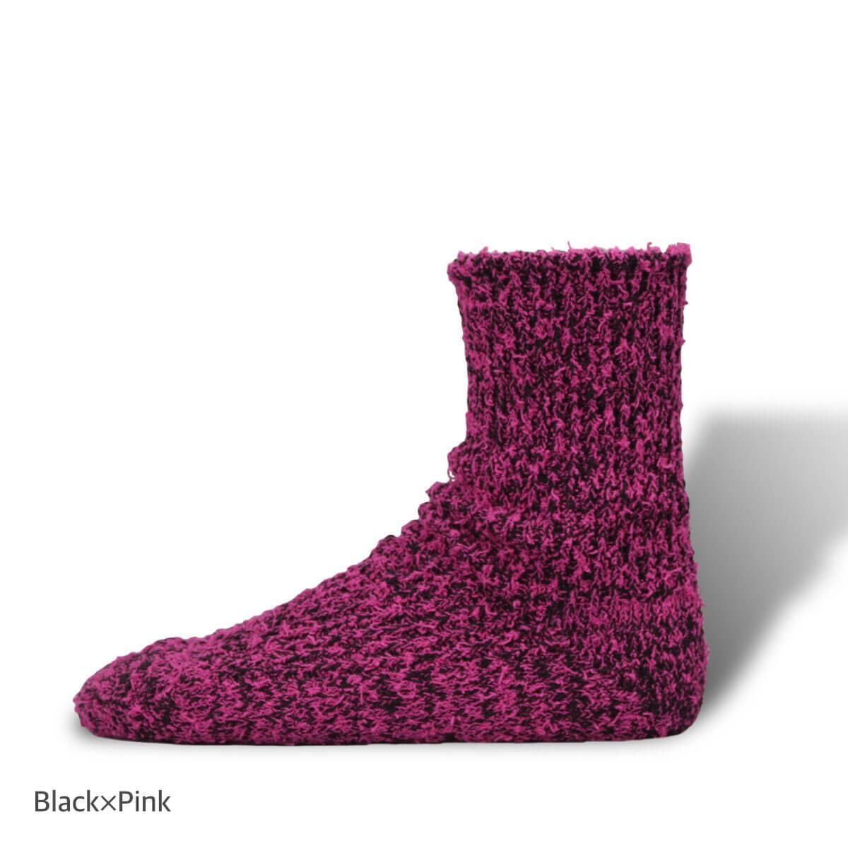 あまり靴下で用いられることのない、強い特徴を持つ個性的な2種類の糸を引き揃えて編むことで、独特な表情に仕上げた靴下。